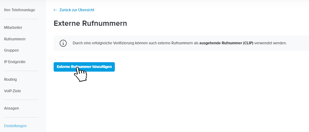 3.) Klicken Sie dann auf den blauen Externe Rufnummer hinzufügen-Button.