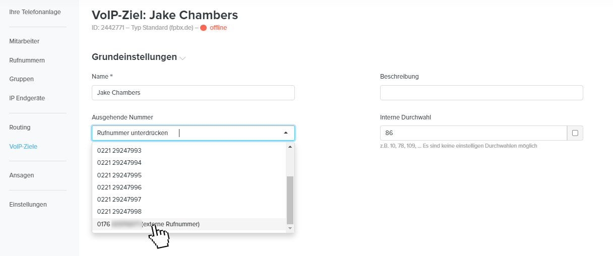 - Klicken Sie auf Administration > VoIP Ziele und wählen Sie das Ziel aus, dessen ausgehende Rufnummer Sie anpassen möchten.