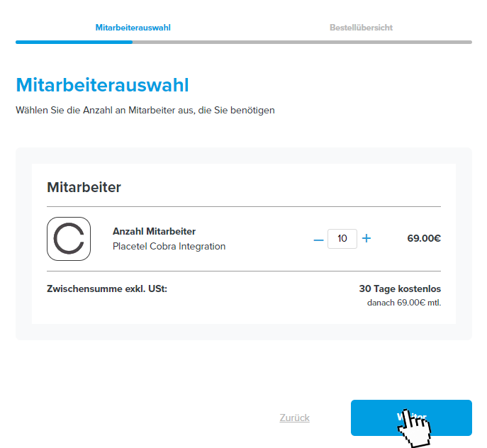 Placetel: Wählen Sie die Anzahl der Mitarbeiter, die Sie buchen möchten. Sie können die Anzahl später im Rahmen der Kündigungsfristen erhöhen oder senken. Klicken Sie dann auf weiter.