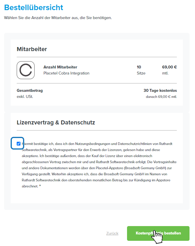 - Placetel: Akzeptieren Sie dabei auch den Lizenzvertrag und die Datenschutzbestimmungen. Abschließend klicken Sie auf kostenpflichtig bestellen.
