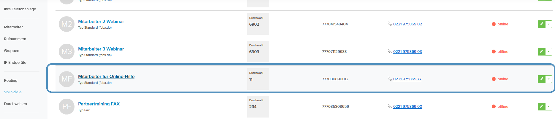 Sollte der von Ihnen angelegte Mitarbeiter nur ein Softphone benötigen, so navigieren Sie über Administration → VoIP-Ziele und dann Klicken Sie auf das entsprechende Ziel.