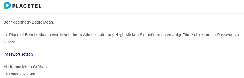 Geben Sie sowohl bei Login für das Placetel-Portal und E-Mail Adresse für Benachrichtigungen die E-Mail Adresse Ihres Mitarbeiters ein. Ihr Mitarbeiter erhält dann eine E-Mail mit einer Anweisung zum Setzen eines Passworts.