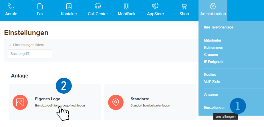 Sie können die Oberfläche Ihrer Telefonanlage mit einem eigenen Logo und einem veränderten Farbschema individualisieren. Zudem können Sie die Spracheinstellungen ändern.