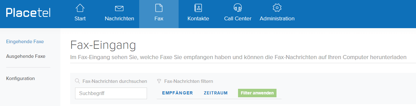 - Faxeingang kann über die Placetel-Weboberfläche erfolgen