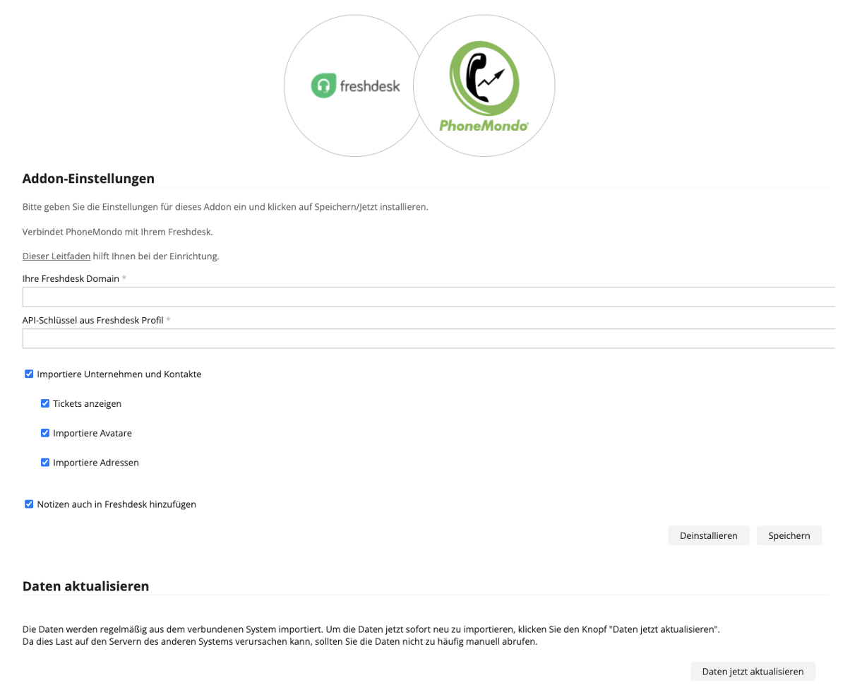 PhoneMondo: Add-On jetzt installieren - PhoneMondo: Wechseln Sie zu Addons, scrollen Sie zu Freshdesk und klicken Sie auf Jetzt installieren.