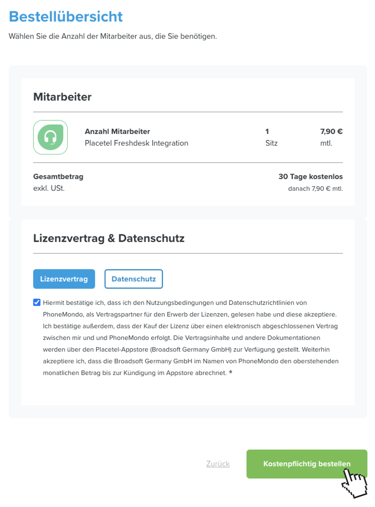 Placetel: Freshdesk buchen - Placetel: Akzeptieren Sie den Lizenzvertrag und klicken Sie auf kostenpflichtig bestellen.