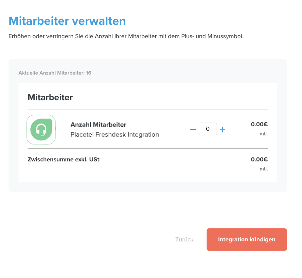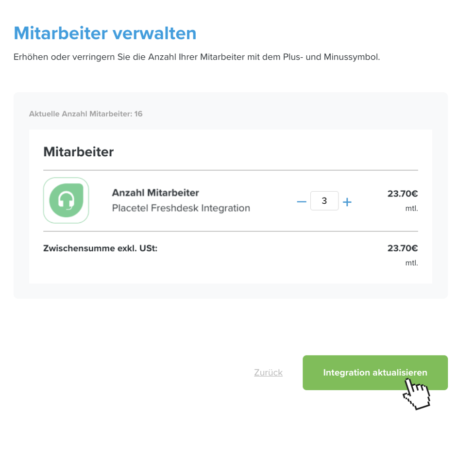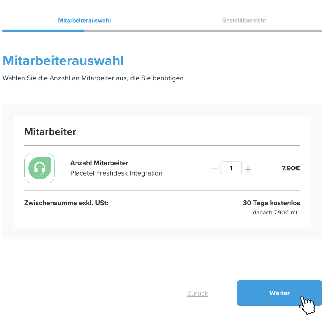 Placetel: Freshdesk auswählen - Placetel: Wählen Sie die Anzahl der Mitarbeiter, die Sie buchen möchten. Sie können die Anzahl später im Rahmen der Kündigungsfristen erhöhen oder senken.