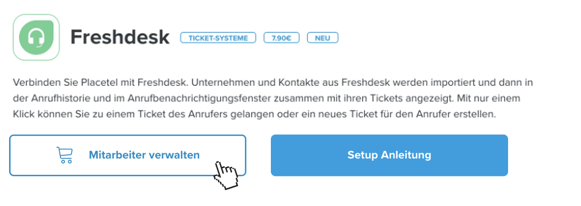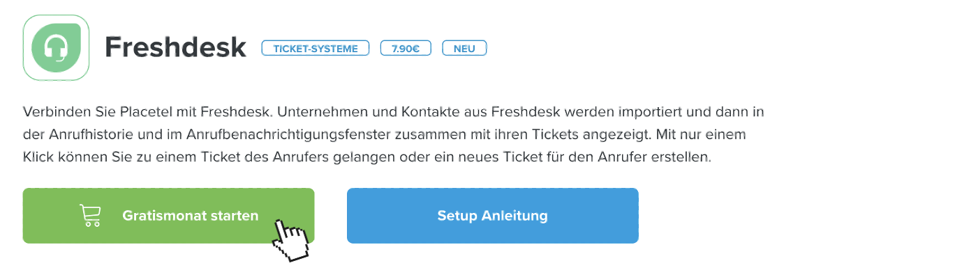 - Placetel: Wählen Sie Integrationen → Freshdesk by PhoneMondo
