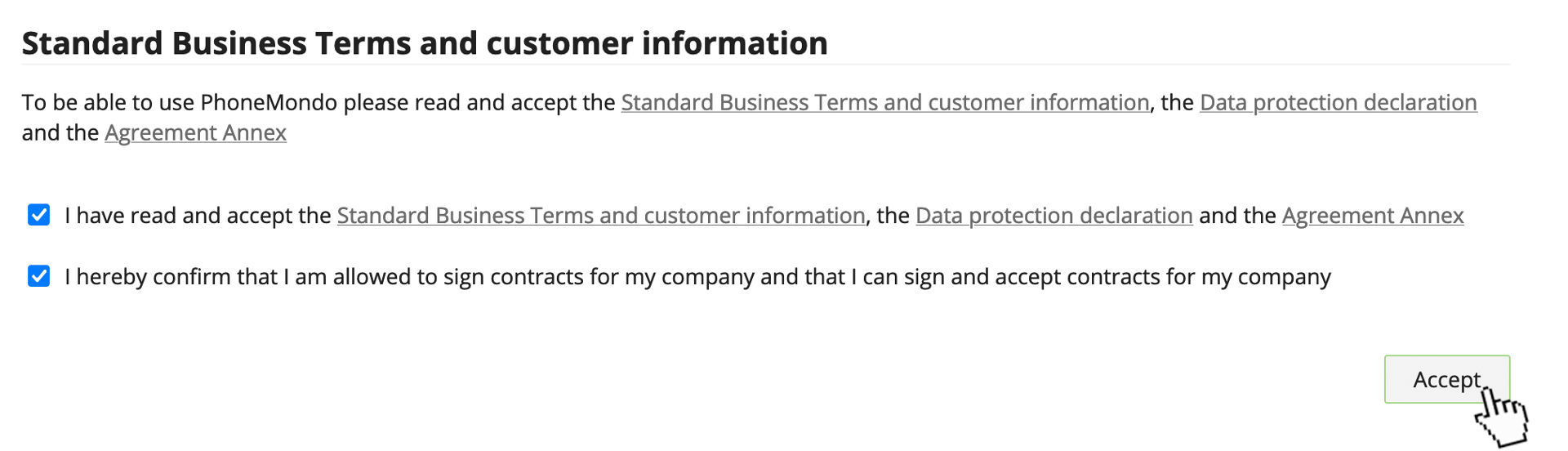 Placetel: Account verknüpfen - PhoneMondo: Akzeptieren Sie die Lizenzvereinbarungen von PhoneMondo.