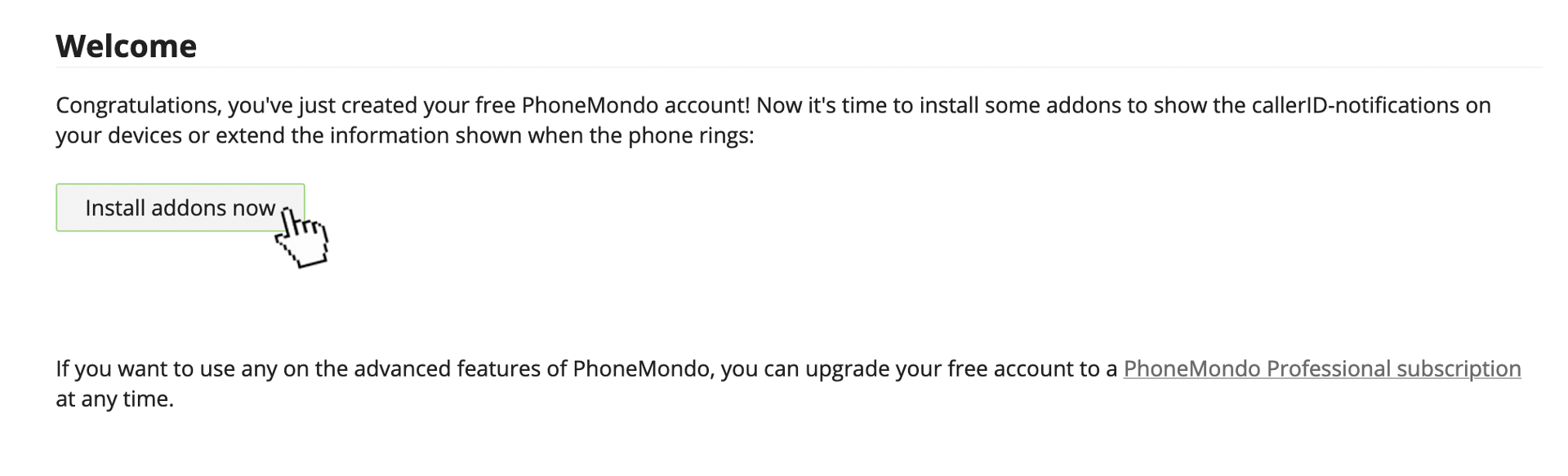 PhoneMondo: Add-On Einstellungen sichern - PhoneMondo: Klicken Sie Install addons now um das entsprechende Add-On für Ihr CRM System zu installieren.