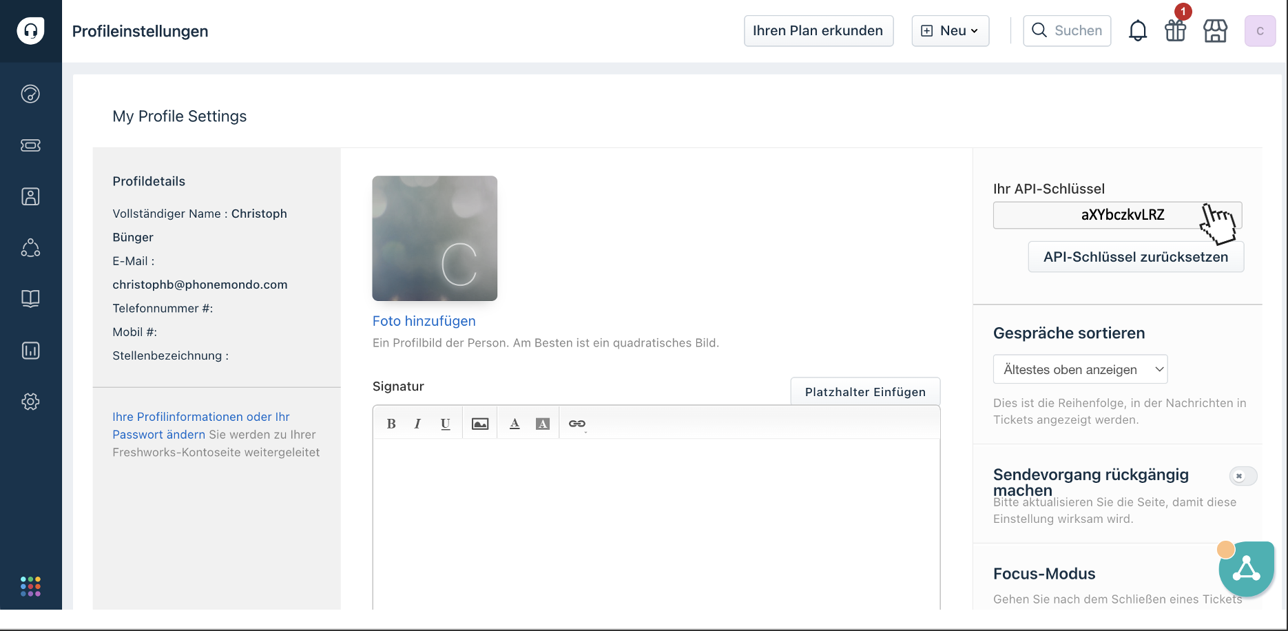 PhoneMondo: sevDesk AddOn installieren - Freshdesk: Generieren Sie Ihren persönlichen API token. Gehen Sie hierzu in Freshdesk auf Profil -> Profileinstellungen. Oben rechts finden Sie Ihren Freshdesk API-Token. Kopieren Sie den API-Token.