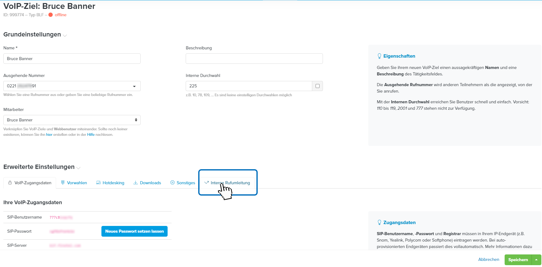 - Sie gelangen zu den Einstellungen für das ausgewählte Voip-Ziel. Hier klicken Sie im unteren Bereich Erweiterte Einstellungen auf die Schaltfläche interne Rufumleitung.