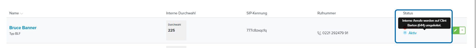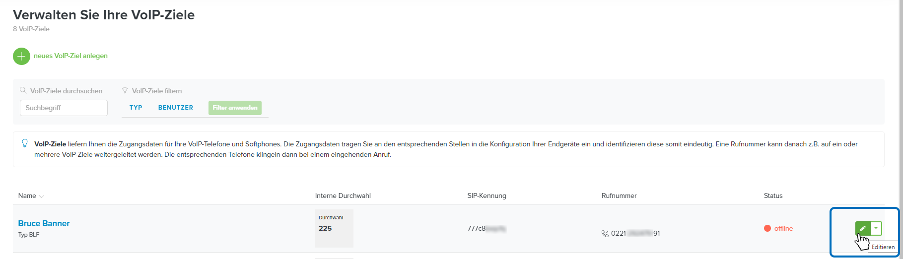 - Scrollen Sie zu Ihrem gewünschten VoIP-Ziel und klicken Sie auf den nebenstehenden grünen Editieren-Button. Beachten Sie, dass das VoIP-Ziel den Typ „BLF“ haben muss.