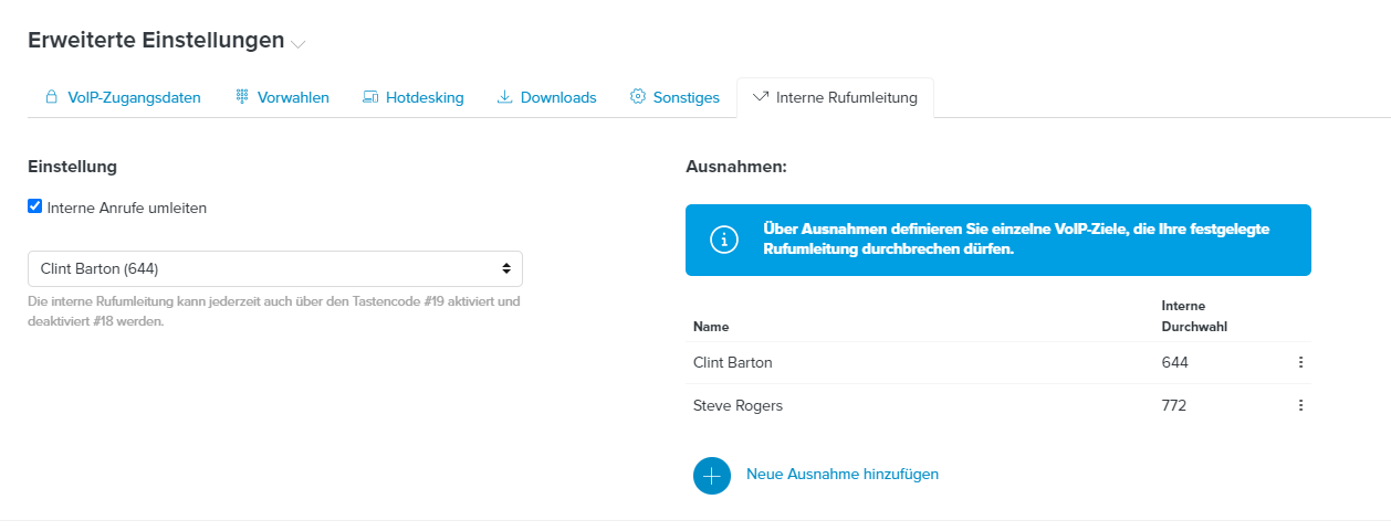 Ausnahmen für die interne Rufumleitung können Sie auch über die VoIP-Einstellungen ändern. Sie finden die Option wieder unter Erweiterte Einstellungen und dann im Menüpunkt interne Weitereitung.