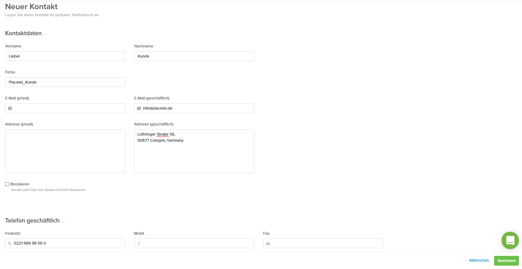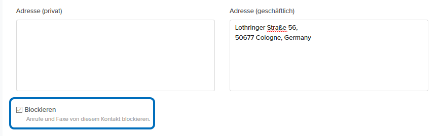 Sie können alle Anrufe mit unterdrückter Rufnummer in einem Kundenkonto blockieren, in dem Sie einen Kontakt anlegen und die Checkbox blockiert aktivieren. Anschließend tragen Sie als Festnetzrufnummer unbekannt ein und speichern den Kontakt.