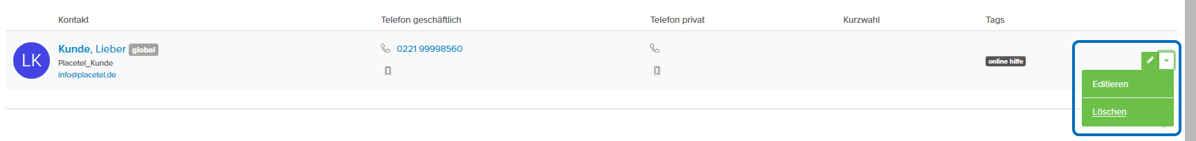 - Öffnen Sie das Bearbeitungsmenü durch Klick auf den entsprechenden Kontakt, geben Sie Ihre entsprechenden Änderungen ein und speichern Sie die Änderungen durch Klick auf den grünen Speichern-Button.
