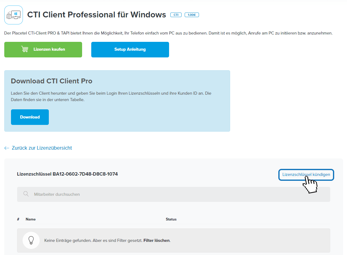 In unserer Anleitung nutzen wir beispielhaft die Kündigung einer CTI Client Professional für Windows Lizenz.