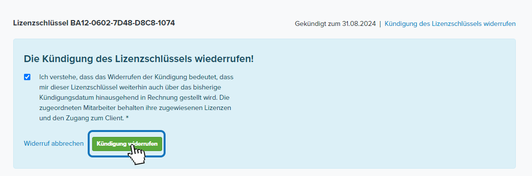 Sollten Sie die Kündigung zurückziehen wollen, navigieren Sie (wie oben beschrieben) wieder zum Editier-Menü der Lizenz und wählen Sie dort: Kündigung des Lizenzschlüssels widerrufen.