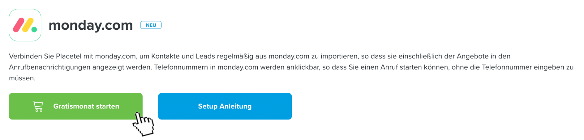 - Placetel: Wählen Sie Integrationen → monday.com by PhoneMondo