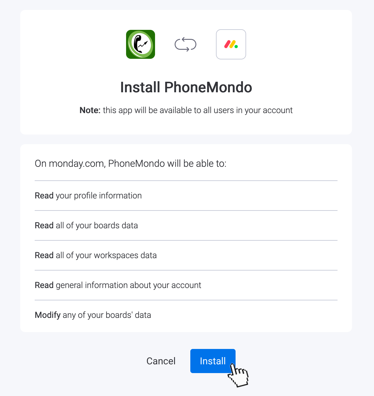 PhoneMondo: monday.com AddOn installieren - monday: Verbinden Sie Ihren monday.com Account. Stellen Sie sicher, dass Sie Pop-Ups im Browser erlauben.