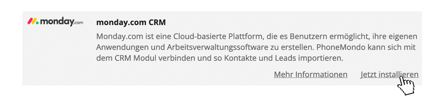 PhoneMondo: Add-On jetzt installieren - PhoneMondo: Wechseln Sie zu Addons, scrollen Sie zu monday.com und klicken Sie auf Jetzt installieren.