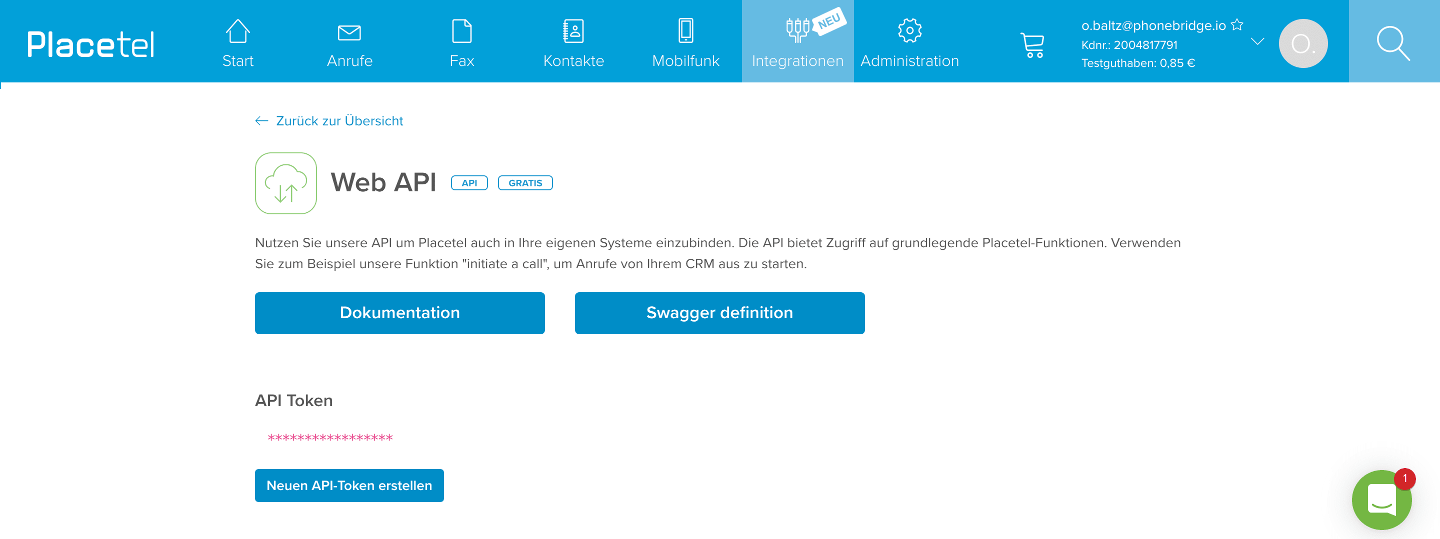 5. Placetel: Auf Ihrer Placetelumgebung muss als nächstes Ihr persönlicher Placetel API-Key erstellt werden. Hierzu navigieren Sie über Integrationen → Web-API → Klick auf „Neuen API-Token erstellen“ um einen neuen API-Token zuerstellen.