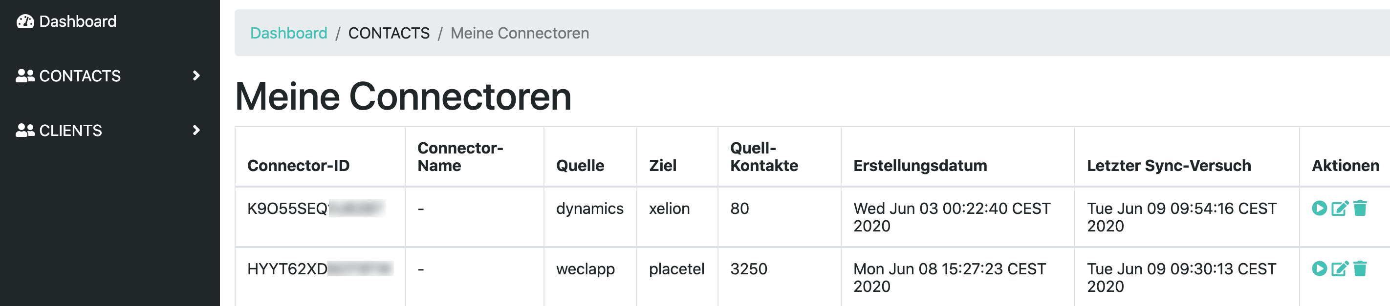7. phonebridge.io: Behalten Sie nun den Sync-Status durch Klicken auf CONTACTS → „Meine Connectoren“ im Blick. Der Sync hat funktioniert, wenn Quelle und Ziel sich erfolgreich verbinden konnten und Ihnen eine Anzahl „Quell-Kontakte“ angezeigt wird.