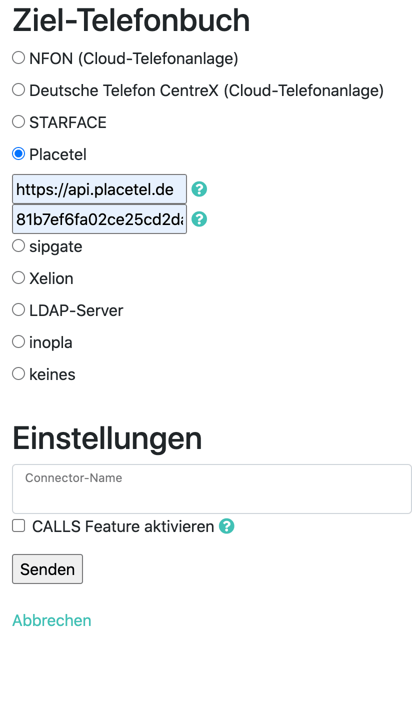 6. phonebridge.io: Wählen Sie „Placetel“ als Telefonbuch-Ziel aus. Geben Sie als „Base-Url“ den Wert https://api.placetel.de ein und als API-Key den soeben erstellen „API-Token“. Durch einen Klick auf Senden speichern Sie den CONTACTS Connector.