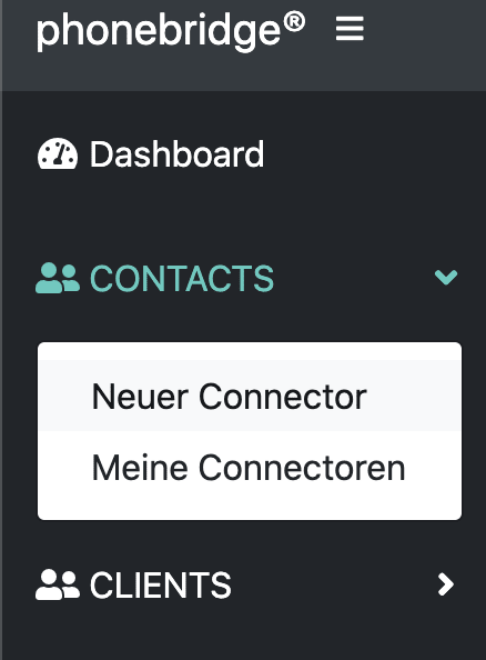 3. phonebridge.io: Klicken Sie anschließend links im Menü auf → CONTACTS -> Neuer Connector..