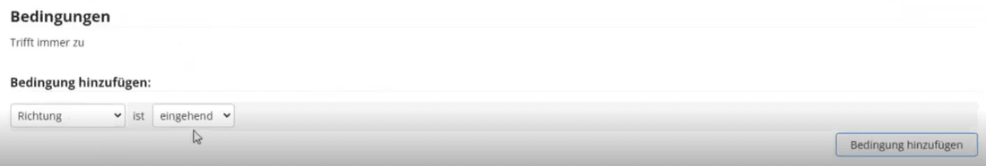 2.) PhoneMondo: Als nächstens navigieren Sie zu dem Bereich Bedingungen. In der linken Dropdown-Box wählen Sie die Option „Richtung“ aus und im rechten Auswahlfeld die Option „eingehend“ und klicken dann auf Bedingung hinzufügen. Dadurch geben Sie konkret an, dass ToDos immer dann erstellt werden, wenn eingehende Anrufe verpasst und nicht angenommen werden.