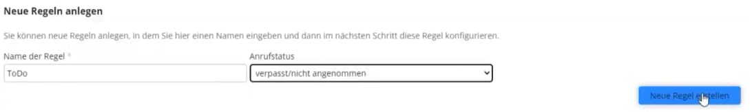 Geben Sie Ihrer Regel einen Namen (z.B. ToDo) und wählen Sie bei Anrufstatus verpasst/nicht angenommen aus. Dadurch greift die Regel eben dann, wenn Anrufe verpasst sind oder nicht angenommen wurden.Klicken Sie dann auf Neue Regel erstellen.