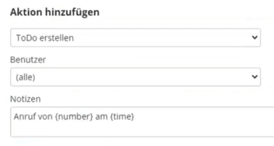 Unter dem Punkt Notizen können Sie eine Nachricht einstellen, die jedesmal zu dem ToDo mit angezeigt wird. Sie können dabei einen Text Ihrer Wahl eingeben. Nutzen Sie dabei ebenfalls die vorgegebenen Textbausteine um beispielsweise mit {date} immer das jeweilige Datum des Anrufs, oder um mit {number} auch die Rufnummer des Anrufpartners anzeigen zu lassen.