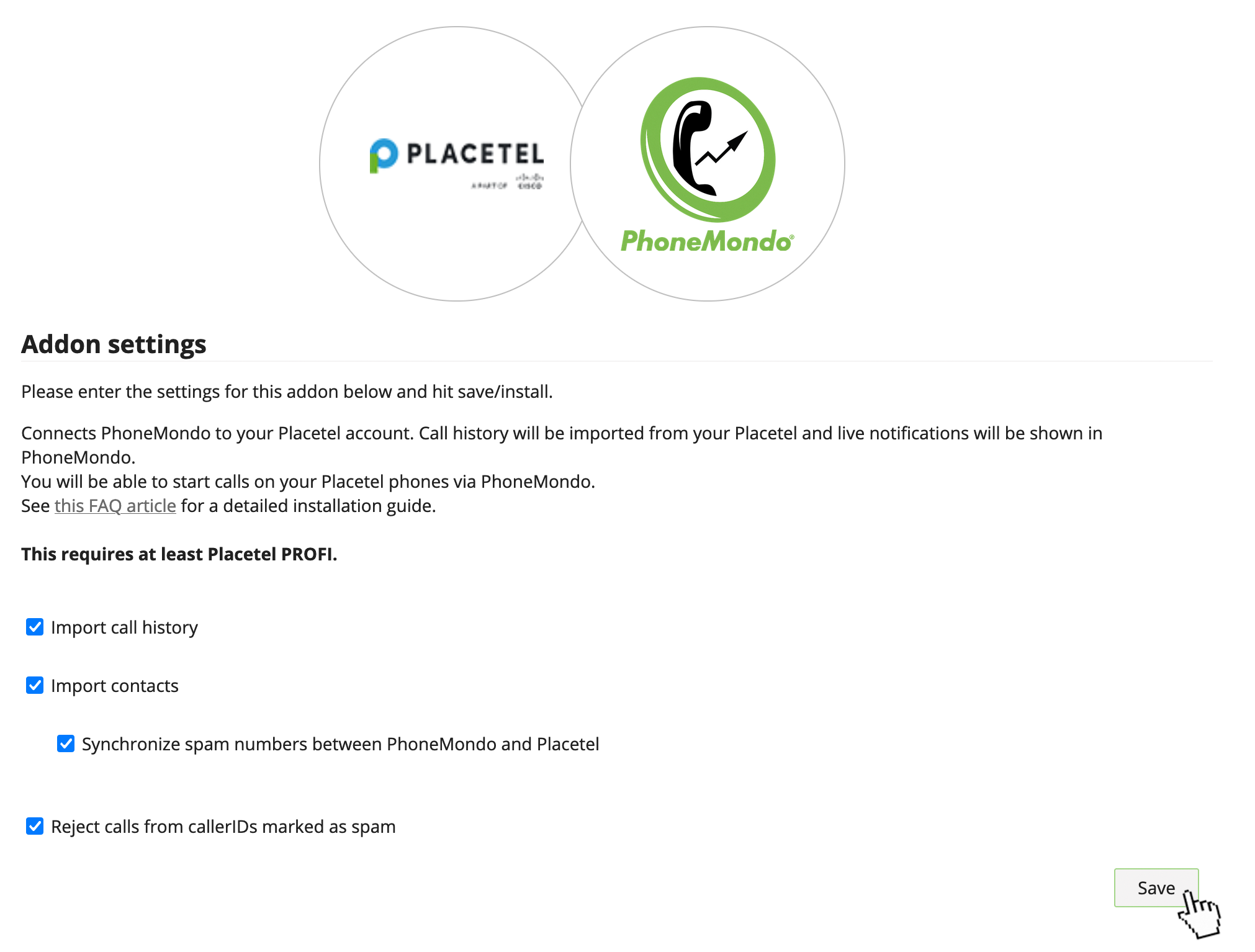 PhoneMondo: Bestätigen Sie die Add-On Einstellungen oder passen Sie diese ggfls. an Ihre Bedürfnisse an.