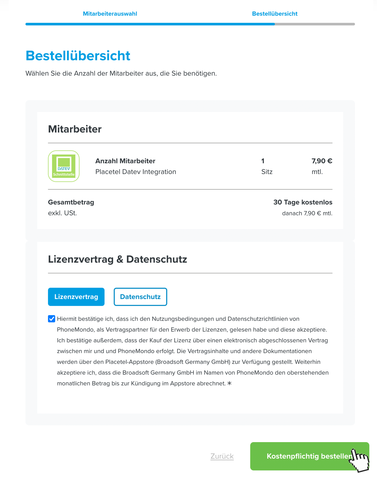 Placetel: Akzeptieren Sie den Lizenzvertrag und klicken Sie auf kostenpflichtig bestellen.