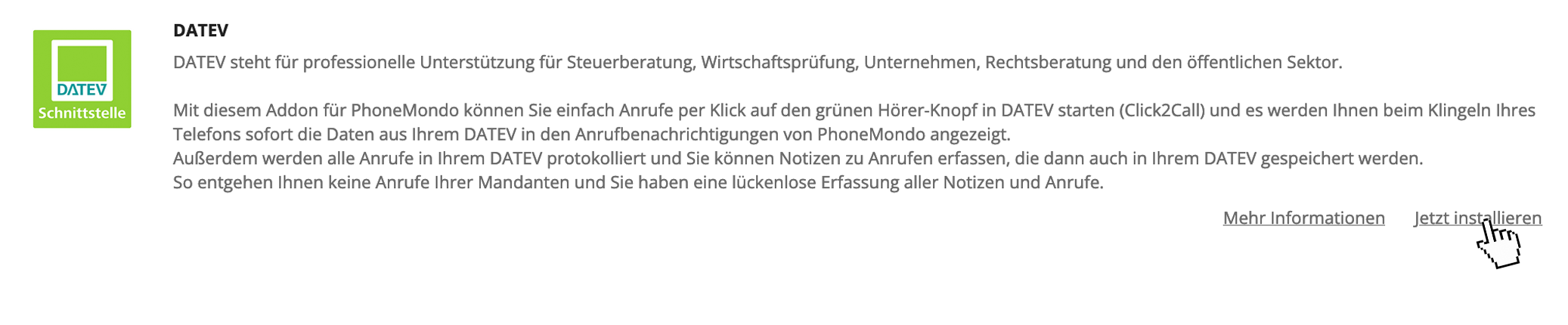 PhoneMondo: Wechseln Sie zu Addons, scrollen Sie zu DATEV und klicken Sie auf Jetzt installieren.