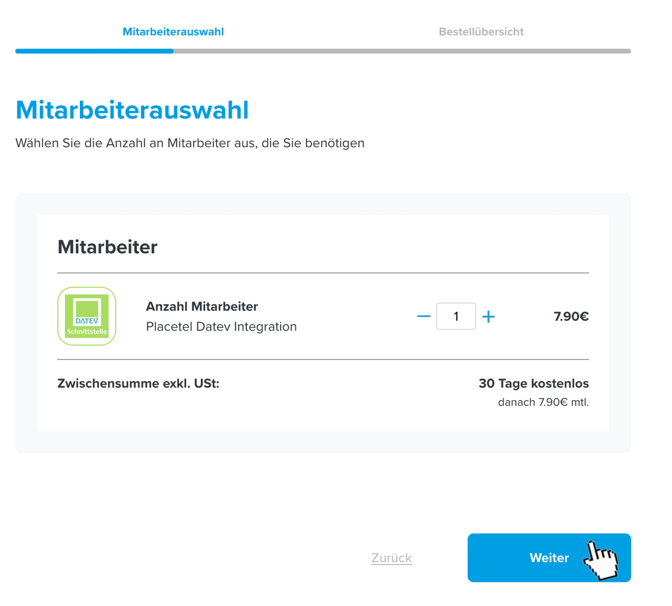 Placetel: Wählen Sie die Anzahl der Mitarbeiter, die Sie buchen möchten. Sie können die Anzahl später im Rahmen der Kündigungsfristen erhöhen oder senken.