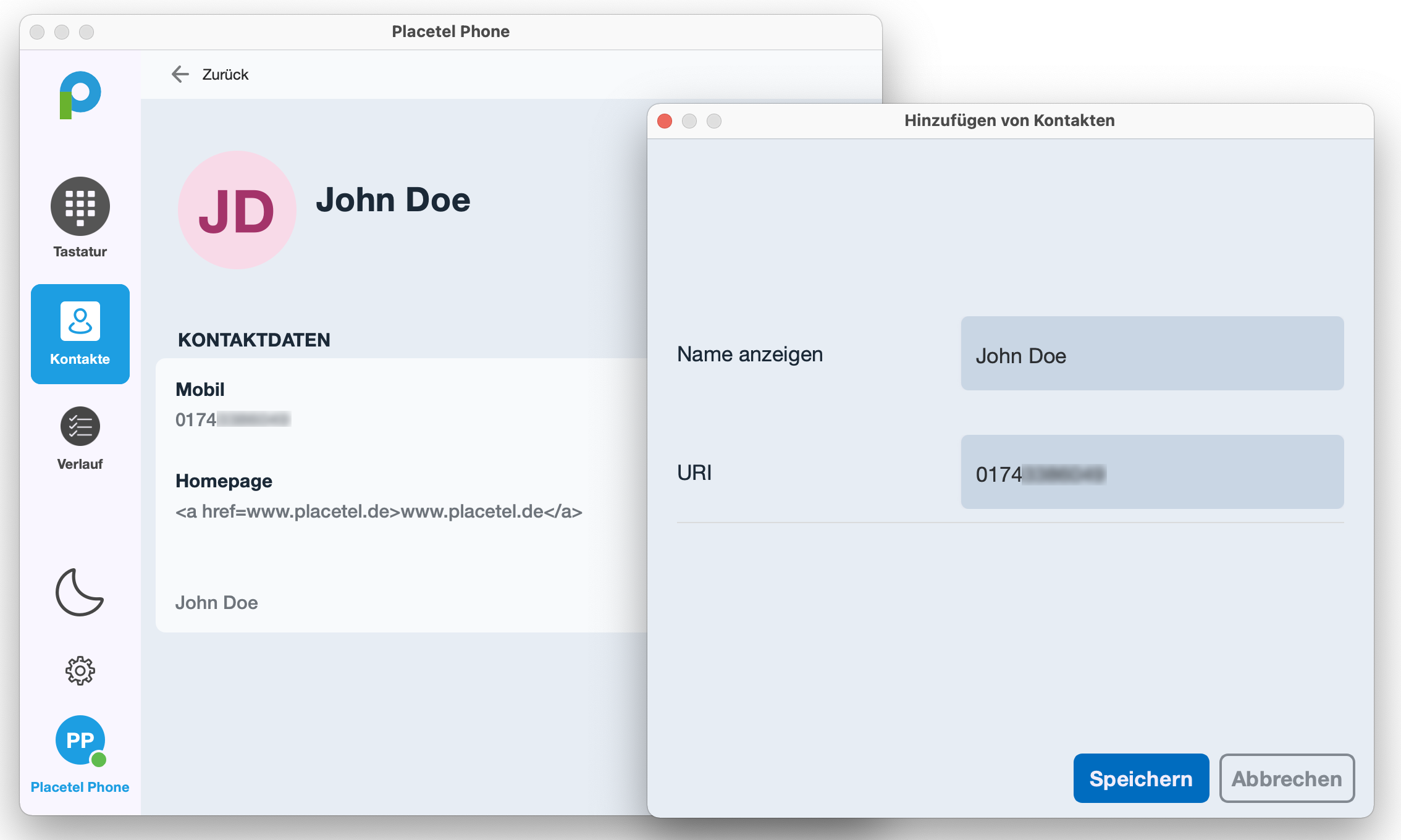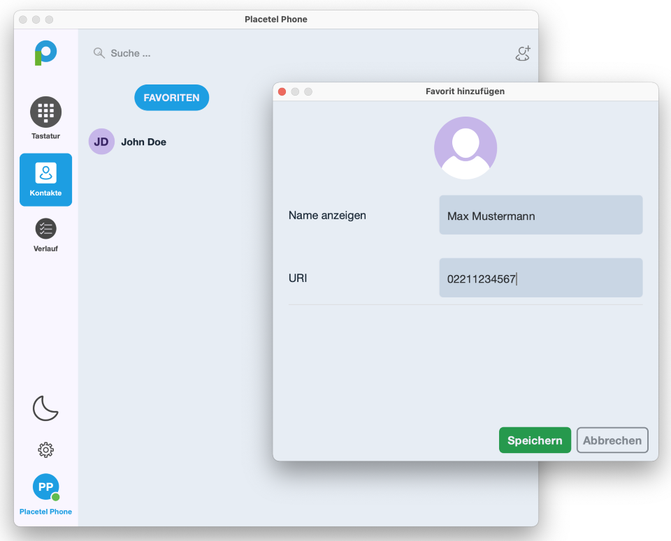 Um einen Kontakt hinzuzufügen klicken Sie auf das Kontakte hinzufügen Symbol. Tragen Sie anschließend den Namen und die Rufnummer des Kontaktes ein. Abschließend klicken Sie auf den Speichern-Button.