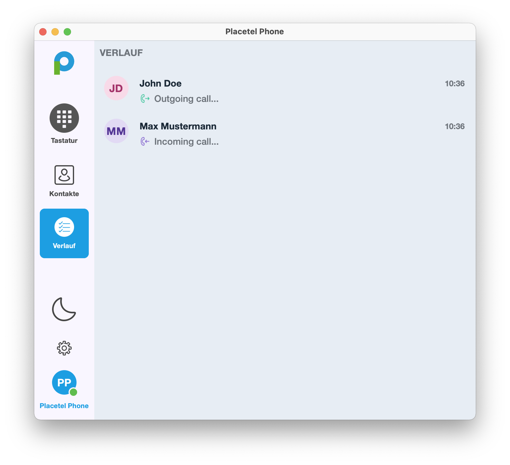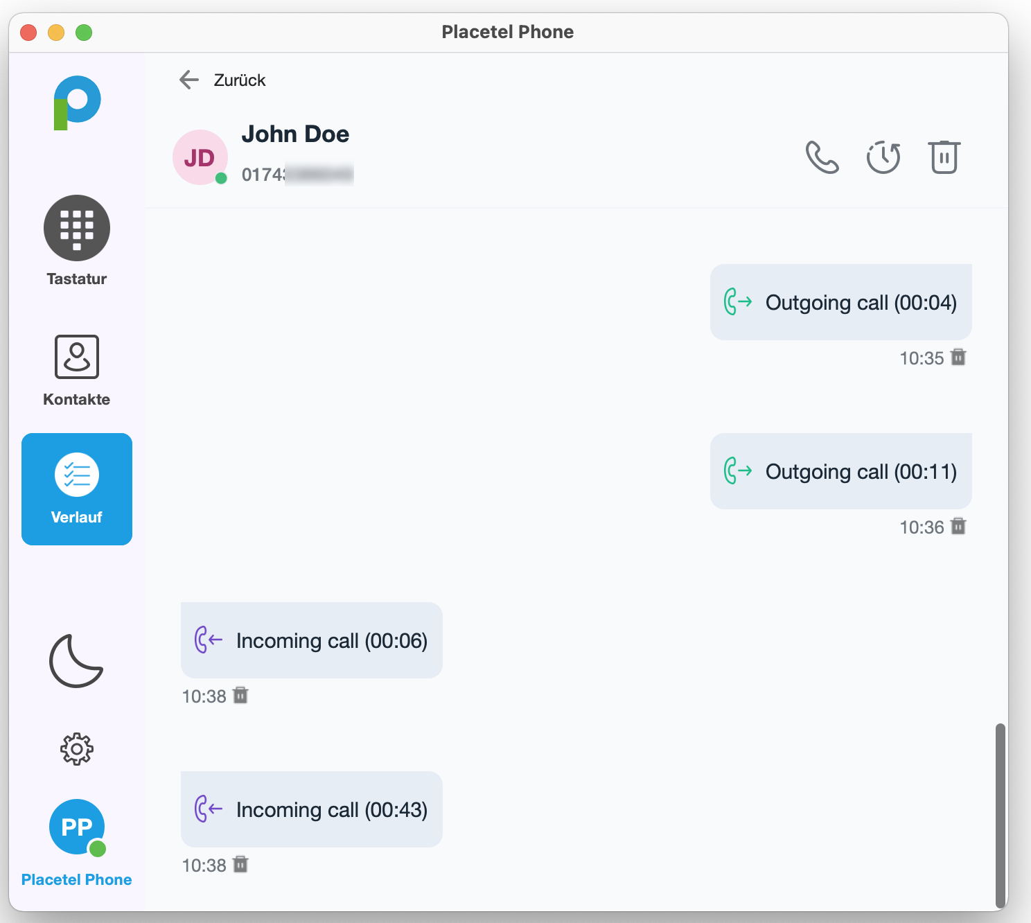 Klicken Sie im linken Navigationsbereich auf die Schaltfläche Verlauf um in die Verlauf-Ansicht zu gelangen. Hier werden Ihnen alle vergangenen Anrufe aufgelistet. Pro Anruf können Sie hier den Gesprächsteilnehmer, die Anrufdauer und den Typ des Anrufs (incoming oder outgoing) einsehen. Die Auflistung der Anrufe ist chronologisch und startet mit dem zuletzt getätigten Anruf.