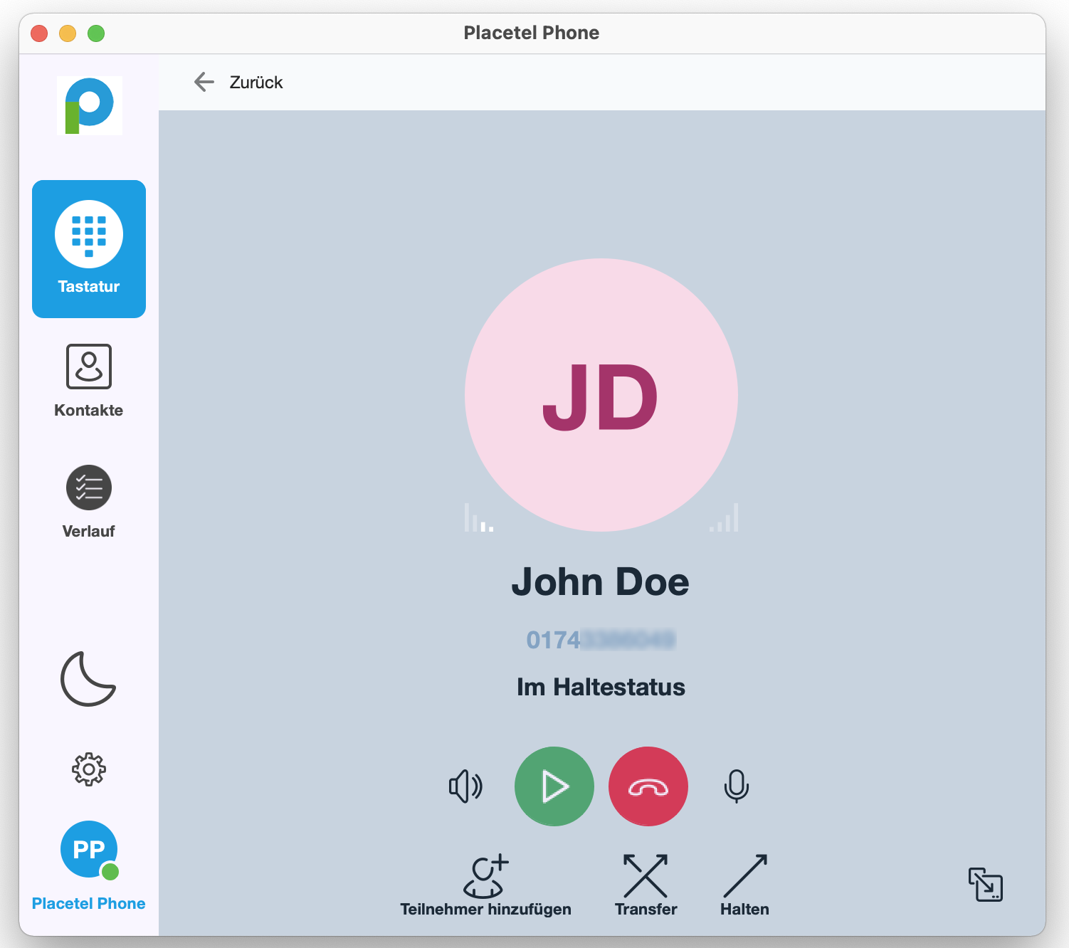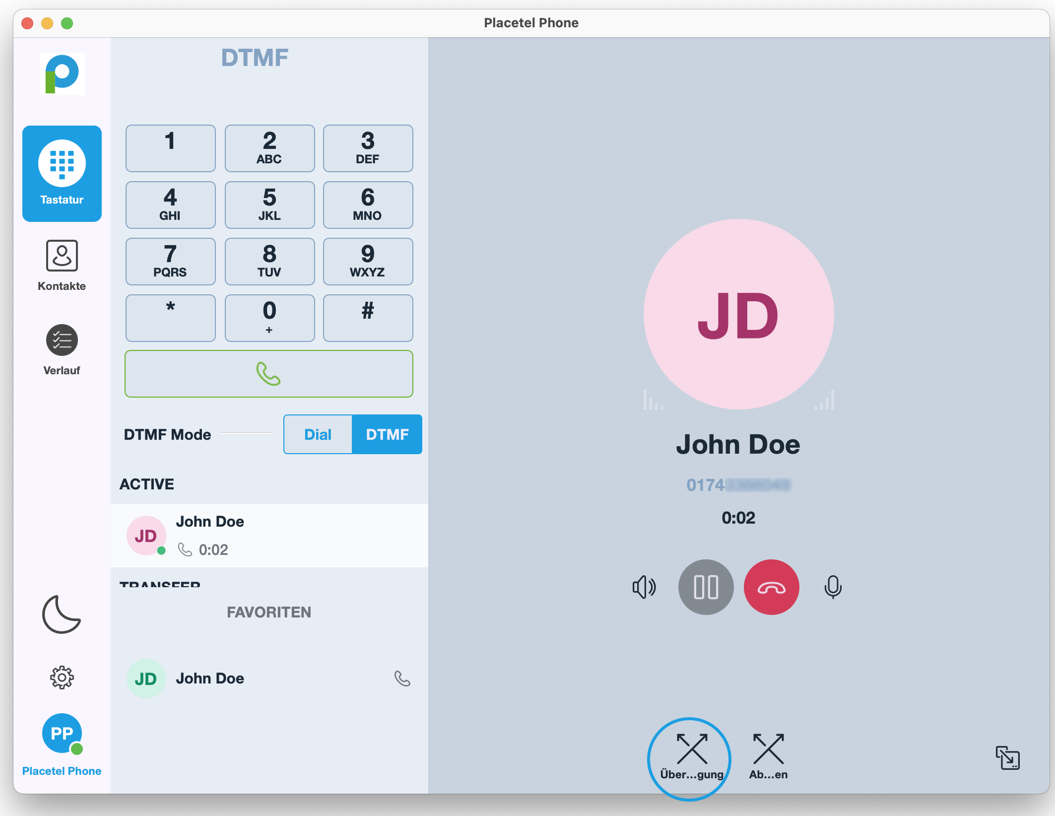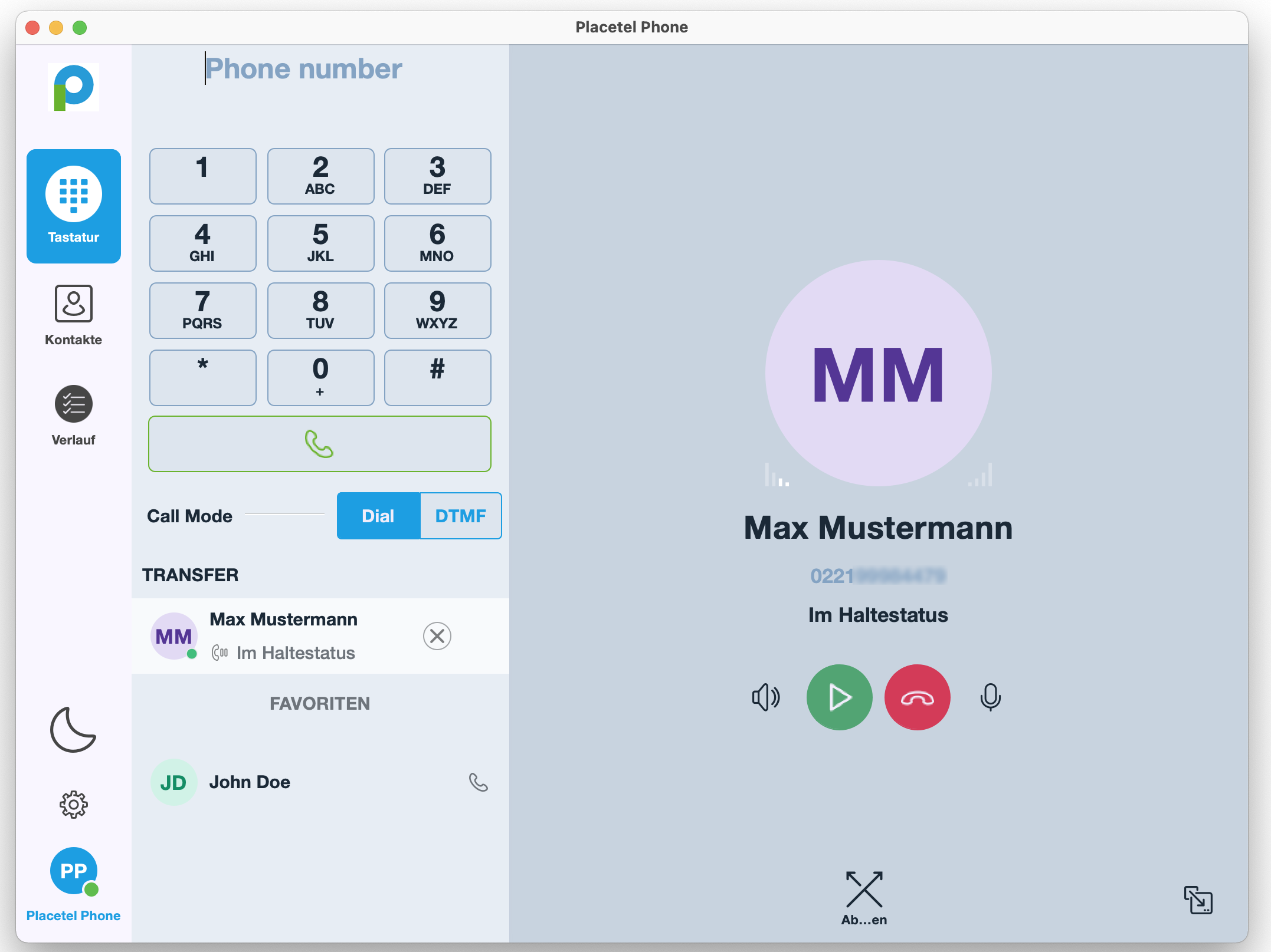 2.) Der Anruf mit Max Mustermann ist nun gehalten. Sie können nun durch Eingabe beim Dial-Pad den Kontakt anrufen, der den Kontakt Max Mustermann entgegennehmen soll (in diesem Beispiel ist das Jon Doe). Sollte das Transferziel (Jon Doe) in Ihrer Favoritenliste gespeichert sein, so können Sie direkt auf das Hörersymbol neben des Namen des Favoriten klicken, um einen Anruf herzustellen.