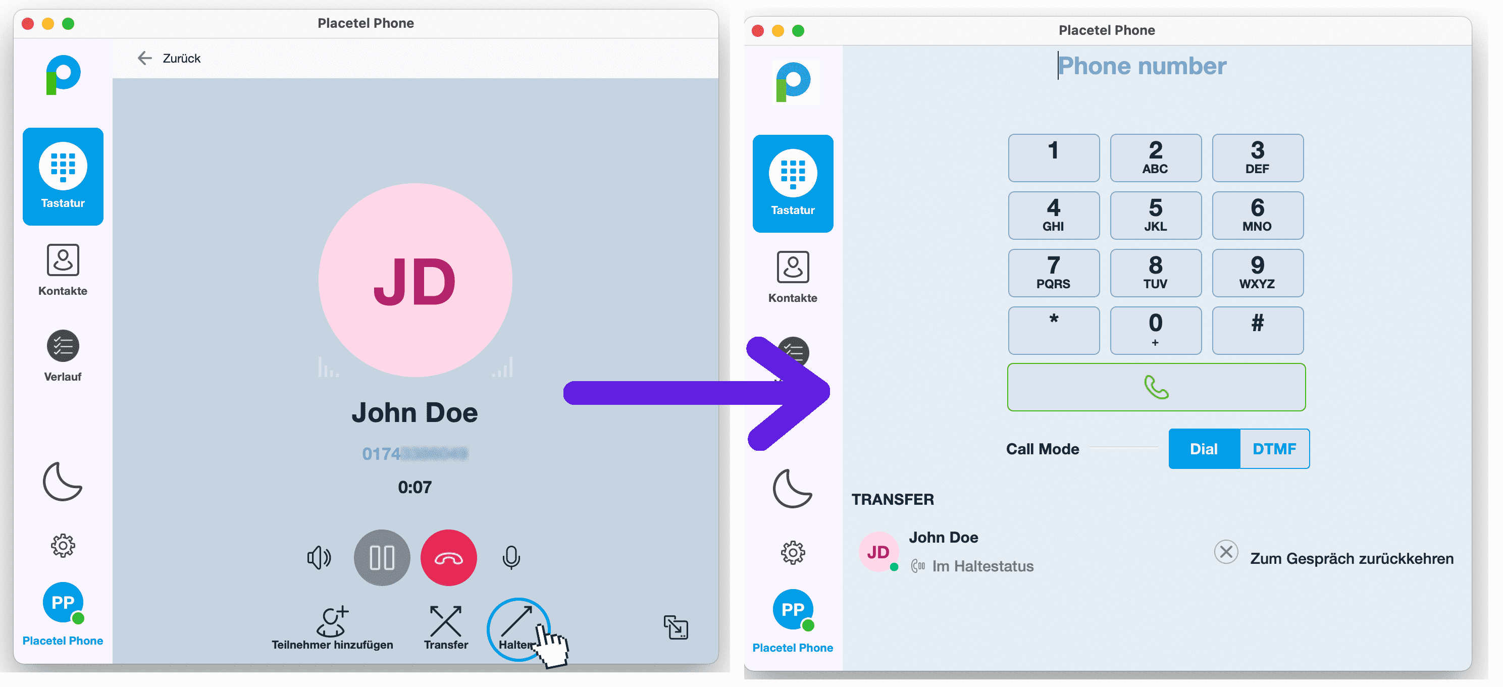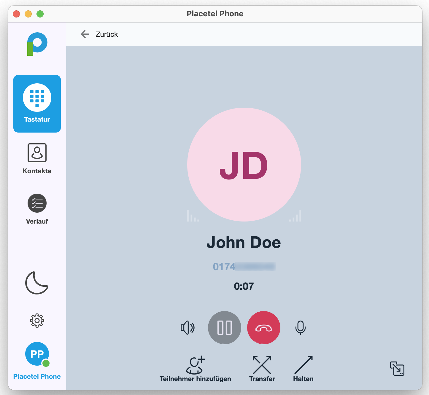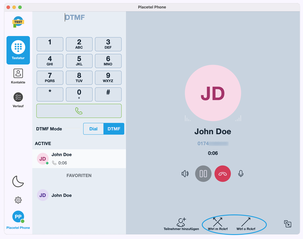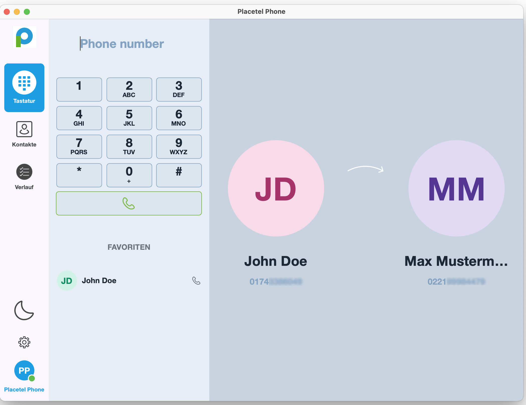 2.) Der Anruf mit Max Mustermann ist nun gehalten. Sie können nun durch Eingabe beim Dial-Pad den Kontakt anrufen, der den Kontakt Max Mustermann entgegennehmen soll (in diesem Beispiel ist das Jon Doe). Sollte das Transferziel (Jon Doe) in Ihrer Favoritenliste gespeichert sein, so können Sie direkt auf das Hörersymbol neben des Namen des Favoriten klicken, um einen Anruf herzustellen.