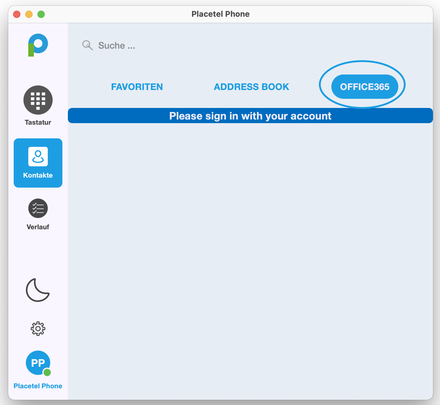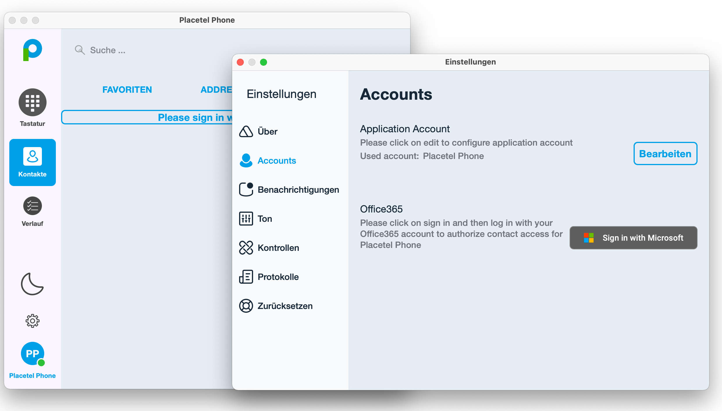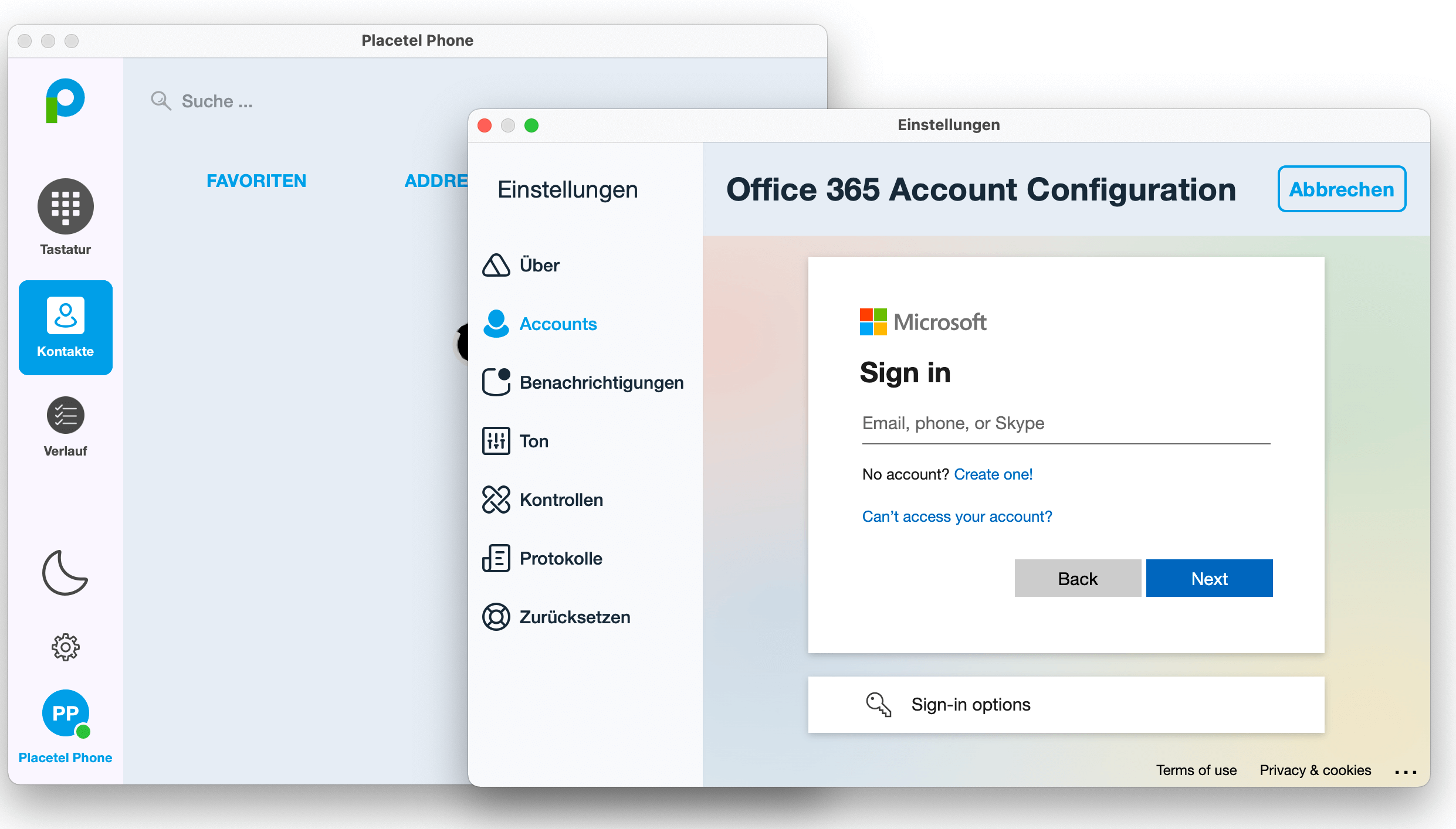 Mit dem Placetel MacOS Softphone können Sie ebenfalls Kontakte aus Ihrem Office 365 Account integrieren. Dafür klicken Sie zuerst auf den linken Kontakte-Tab. Es öffnet sich Ihre Kontakte-Übersicht. Unterhalb der Suchleiste befindet im rechten Bereich der Office 365 Button, klicken Sie darauf. Sie gelangen dann zu den Accounts-Einstellungen. Hier haben Sie die Möglichkeit sich mit Ihrem Office 365 Account anzumelden, indem Sie zuerst auf „Sign in with Microsoft“ klicken und dann dem Anmeldeprozess weiter folgen. Nach abgeschlossener Synchronisation werden Ihnen Ihre Office 365 Kontakte innerhalb der Kontakübersicht angezeigt.