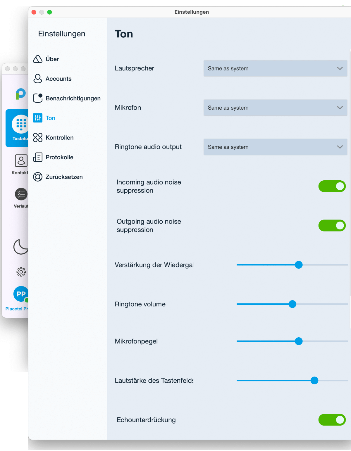 Innheralb der Toneinstellungen legen Sie Einstellungen wie Lautstärke, Verwendung Endgeräte und Echounterdrückung fest.