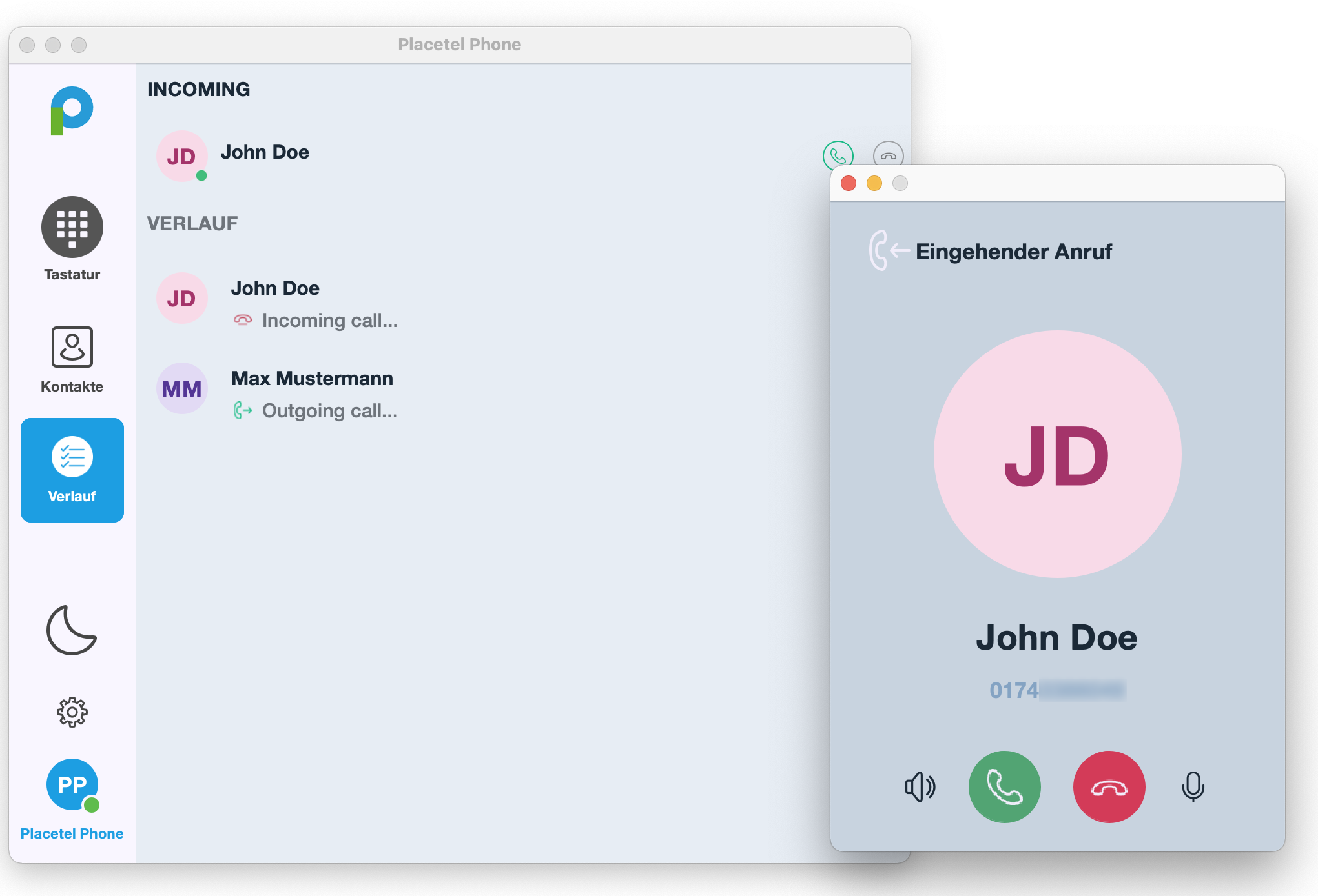 In diesem Beispielszenario ruft Max Mustermann an und möchte mit Jon Doe verbunden werden. Sie nehmen den Anruf von max Mustermann entgegen.