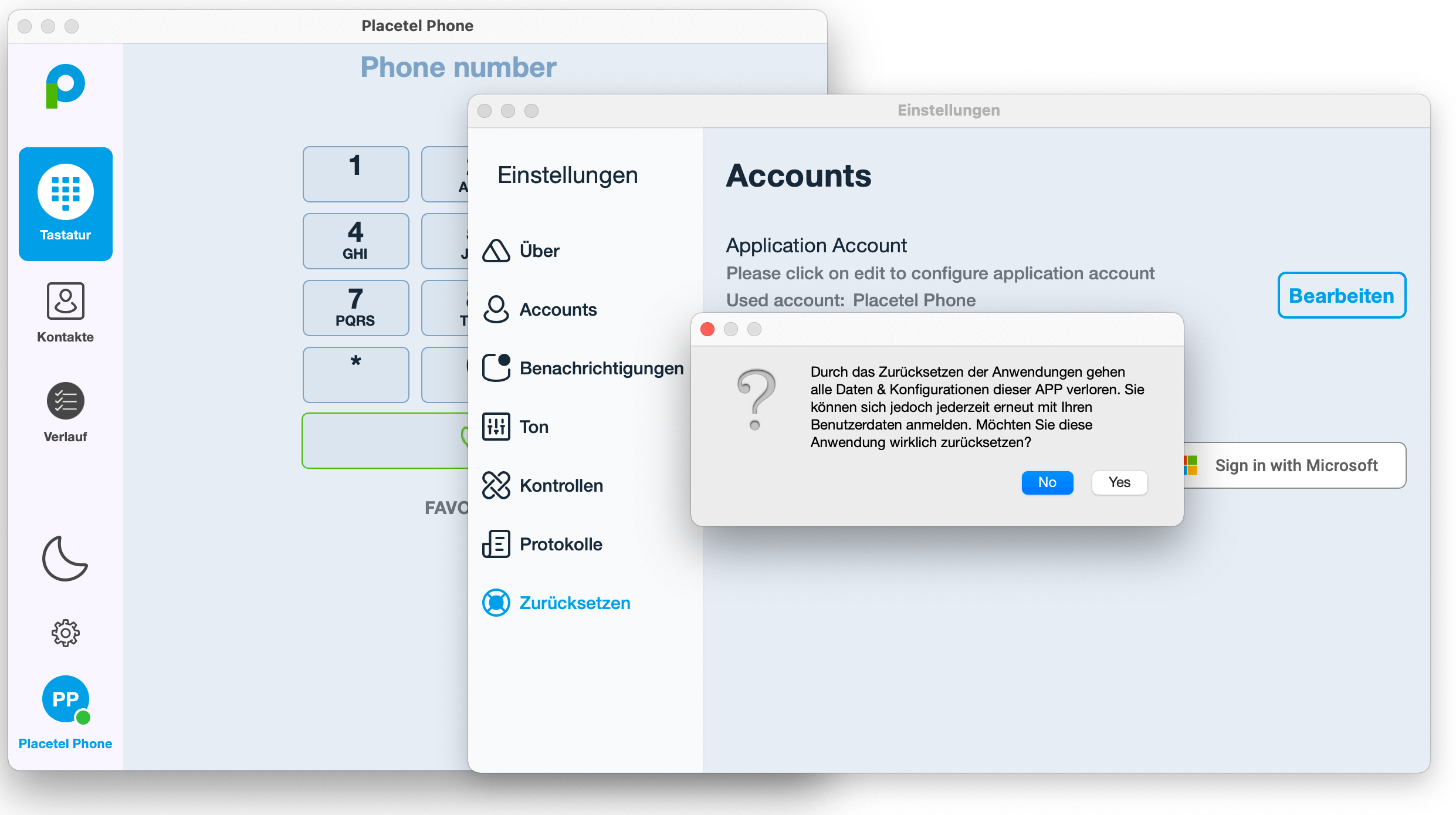Klicken Sie im Einstellungsmenü auf Zurücksetzen, um ihr Softphone zurückzusetzen. Hierbei würden Sie alle gespeicherten Daten und Konfigurationen verlieren und ihr Softphone auf die Standardeinstellungen zurücksetzen. Die Möglichkeit zur Anmeldung mit Ihren Login-Daten bleibt nach dem Zurücksetzen weiterhin bestehen. Jedoch müssten Sie dann das Softphone komplett neu konfigurieren.
