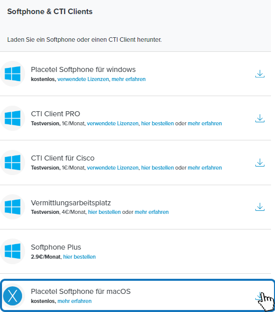 VoIP-Ziele Übersicht - Hier finden Sie u.a. das Placetel Softphone für macOS. Klicken Sie auf das Download Symbol, um hier den Download direkt einzuleiten.