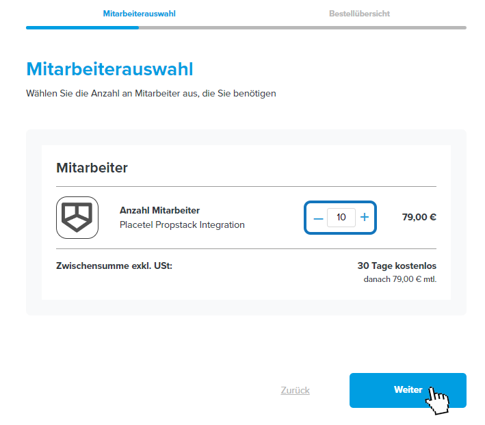 Placetel: Propstack auswählen - Placetel: Wählen Sie die Anzahl der Mitarbeiter, die Sie buchen möchten. Sie können die Anzahl später im Rahmen der Kündigungsfristen erhöhen oder senken.