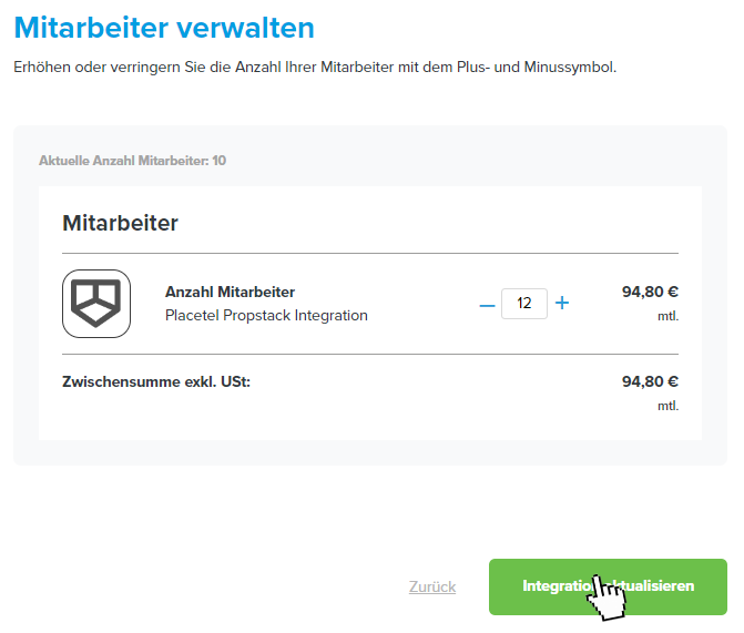 Placetel: Mitarbeiter verwalten - Placetel: Erhöhen Sie die Anzahl der gewünschten Mitarbeiter.