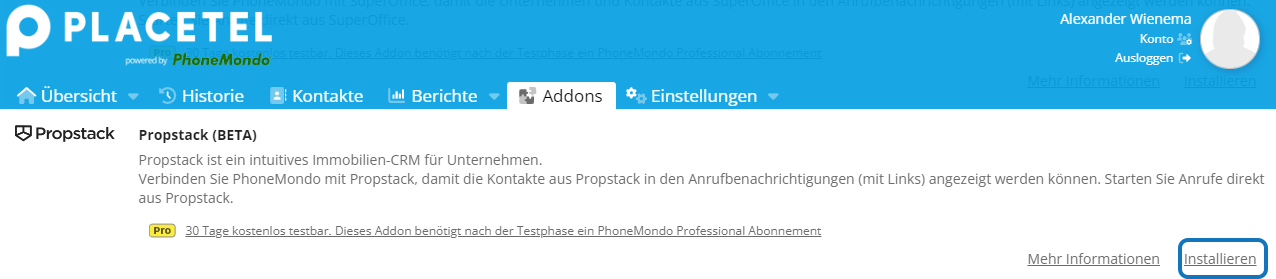 PhoneMondo: Add-On jetzt installieren - PhoneMondo: Wechseln Sie zu Addons, scrollen Sie zu Propstack und klicken Sie auf Install Now.