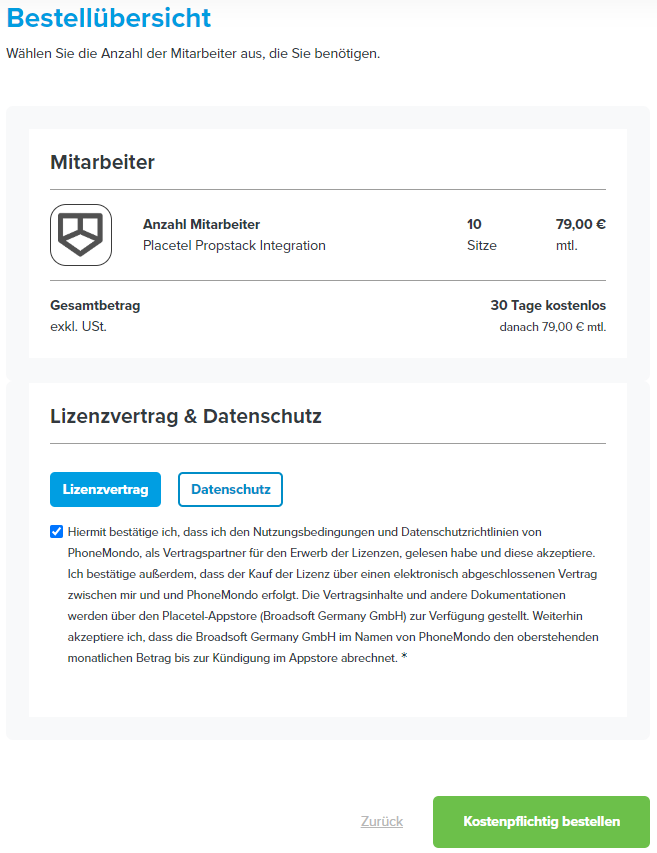 Placetel: Propstack buchen - Placetel: Akzeptieren Sie den Lizenzvertrag und klicken Sie auf kostenpflichtig bestellen.