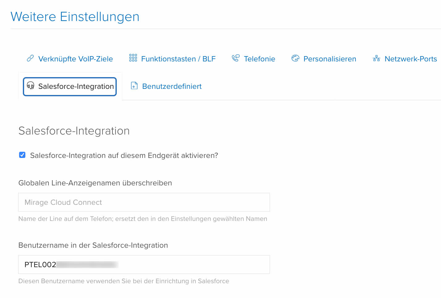 - Wählen Sie auch dort in den Reiter Salesforce-Integration. Hier bestimmen Sie ob das Gerät für Salesforce verwendet wird und geben den, von unserem Integrationspartner erhaltenen, PTEL-Benutzernamen an. Im nächsten Feld können Sie auch den Anzeigenamen für das spezifische Telefone überschreiben.